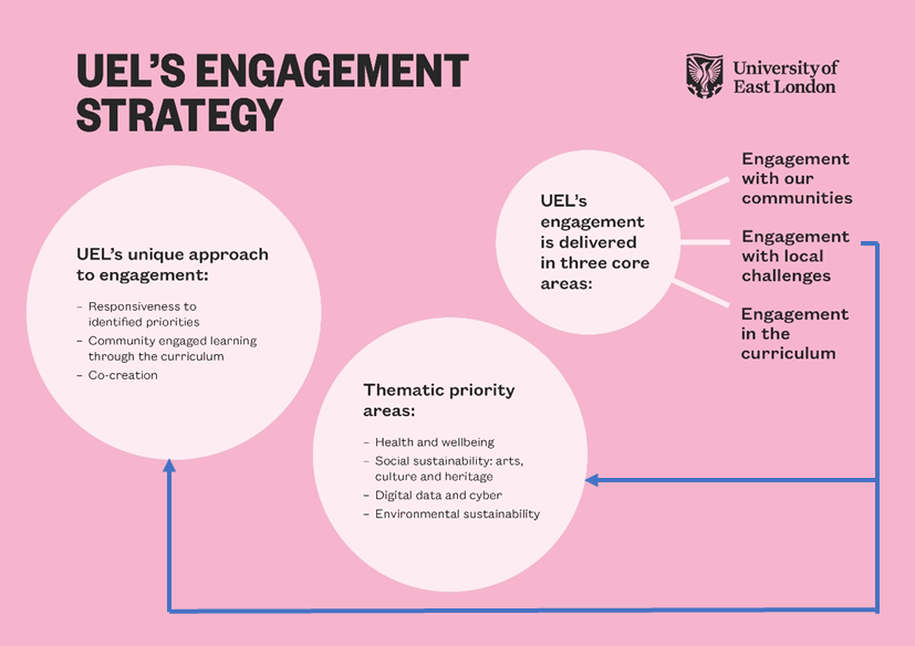 UEL’s approach to public and community engagement is focused on our strengths as an anchor institution and our strong tradition of working collaboratively, engaging with communities and responding to local challenges. Central to Vision 2028, UEL’s strategic plan, engagement is embedded in one of four strategic objectives: ‘to increase the economic, social and cultural impact of our education, research and enterprise activities to the communities we serve’. UEL engagement is delivered in three core areas: engagement with our communities; engagement through the curriculum and engagement with local challenges. We focus on four thematic priorities: health and wellbeing; social sustainability including arts, culture and heritage; digital data and cyber; environmental sustainability.