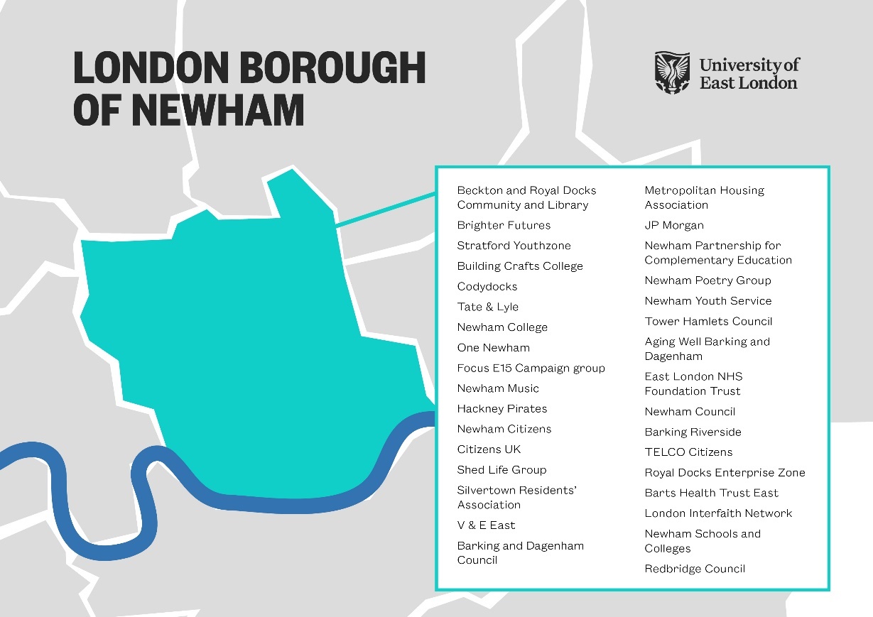 UEL’s approach is based on in-depth and ongoing consultation with a range of communities, organisations and stakeholders to identify our most pressing challenges. We commissioned an innovation specialist agency to survey the community skills gaps in East London to ensure the programmes we deliver and spaces we build are responding to trends and needs within the region. UEL’s membership of networks and partnerships, enables alignment with borough-wide priorities, for example, Newham Public Health, Tower Hamlets health inequalities initiative and Economic Development Partnership Board…etc, e.g. TELCO Citizens, Royal Docks Enterprise Zone and Barts Health Trust Interfaith Network.