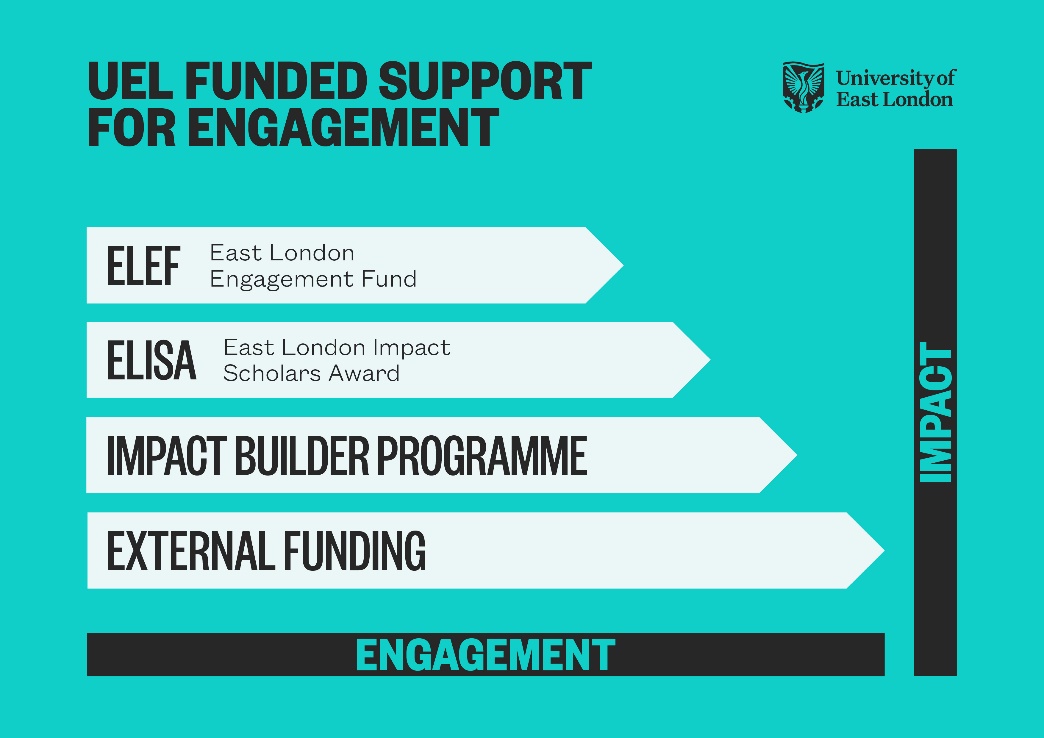 East London Impact Scholars Award (ELISA): students and academics working with community organisations to explore a topic, exchange knowledge and co-create with non-academic audiences.