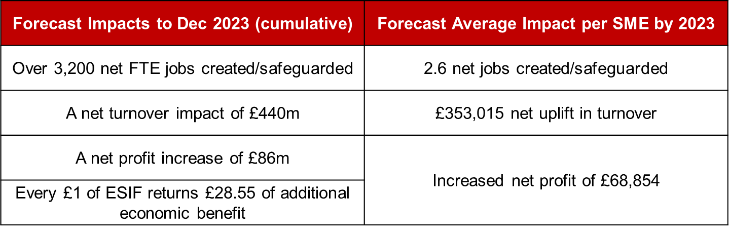 In 2019, Lancaster University commissioned an independent economic evaluation of our business innovation collaboration programmes funded through European Structural and Investment Funds (ESIF). Almost 200 SMEs were surveyed to assess the impact of the support they had received from the University. The evaluation provided us with an independent assessment of our work, whether our offer was fit for purpose and represented perceived and measurable value for both beneficiaries and funders. The forecasted impacts to December 2023, cumulative across all programmes and individual SME level are shown in Table 1.