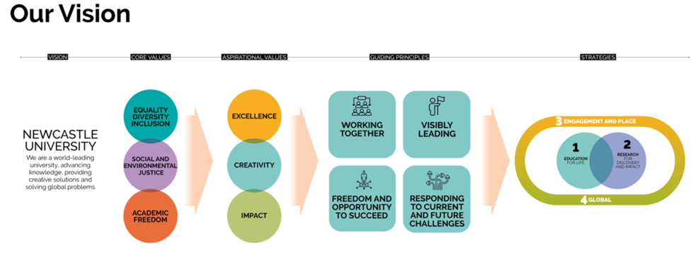 Newcastle University traces its foundation to the 1830s and was established to respond to the North-East of England’s industrial, maritime, agricultural and healthcare needs. We are deeply committed to our region and have a proud record of civic engagement and of driving social and environmental justice. We orientate our research and education to benefit society, economically, culturally and environmentally. We are a research-intensive university, acting as an innovation hub for our region. But as well as being locally engaged, we are globally connected. Our research-informed education provides opportunities for students from all backgrounds to fulfil their potential as global citizens. To achieve our vision, we work closely with public, private and voluntary sector partners, locally, nationally and globally.