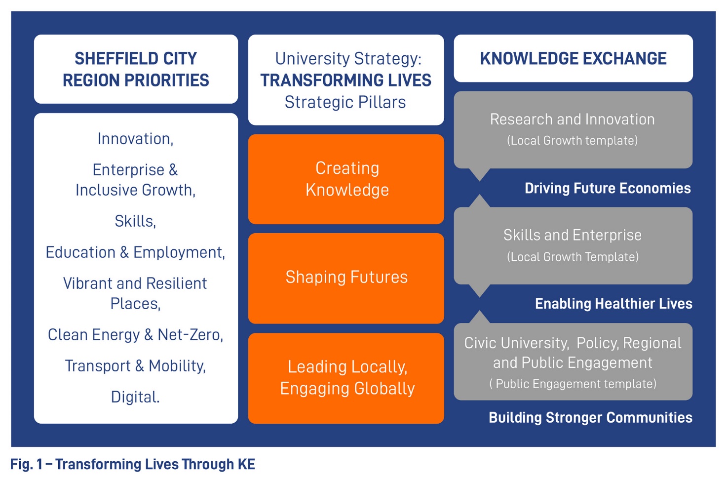 At Sheffield Hallam, our approach to knowledge exchange emerges from our values as an institution. Our Transforming Lives strategy (Fig 1.) demonstrates our belief that universities should make material contributions to the cultural, economic, social and health challenges facing society. Most importantly, we believe that the pursuit of knowledge has the power to transform lives through applied research, learning and multi-disciplinary partnerships.
