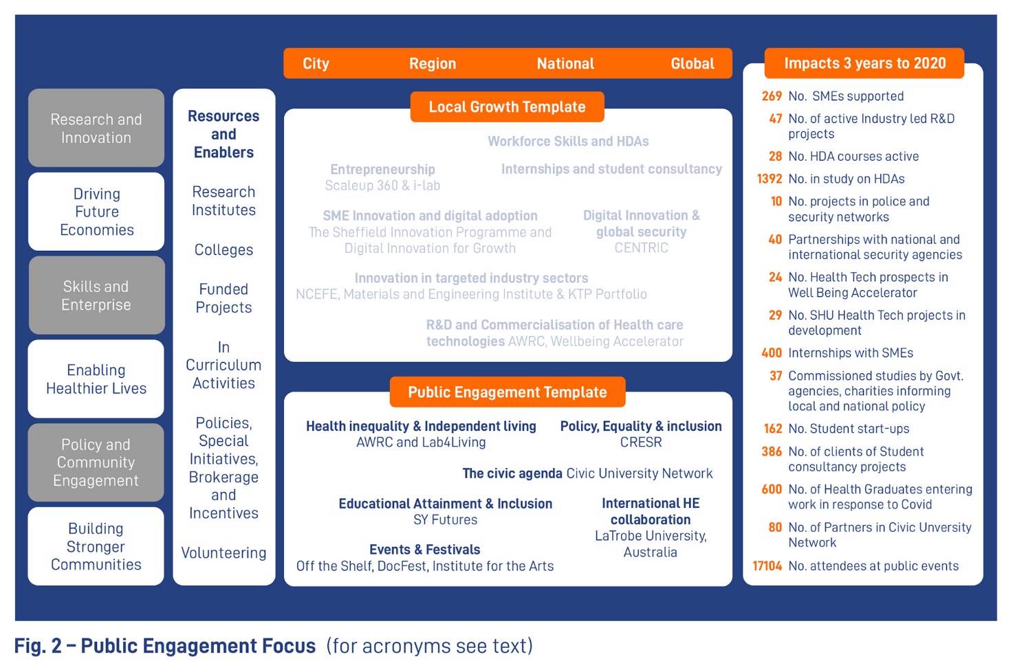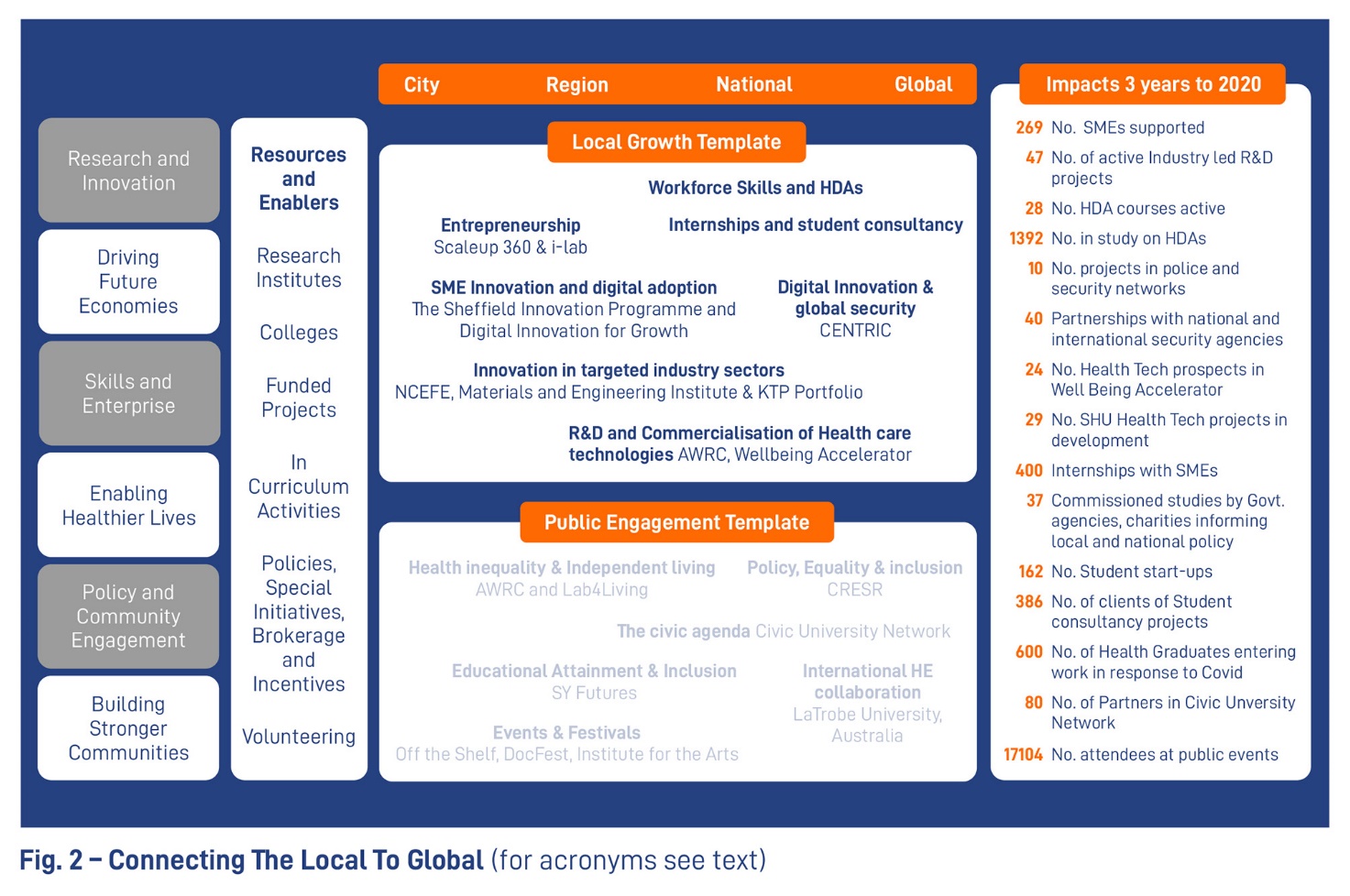 Our collaborations address global and local challenges, for example, the low level of R&D and significant skills deficit in the Sheffield City Region (SCR). We take a partnership approach in responding to these challenges (Fig.2), working with the SCR Business Growth and Skills Boards, and key stakeholders including NHS Trusts, local businesses, HE providers and local communities.