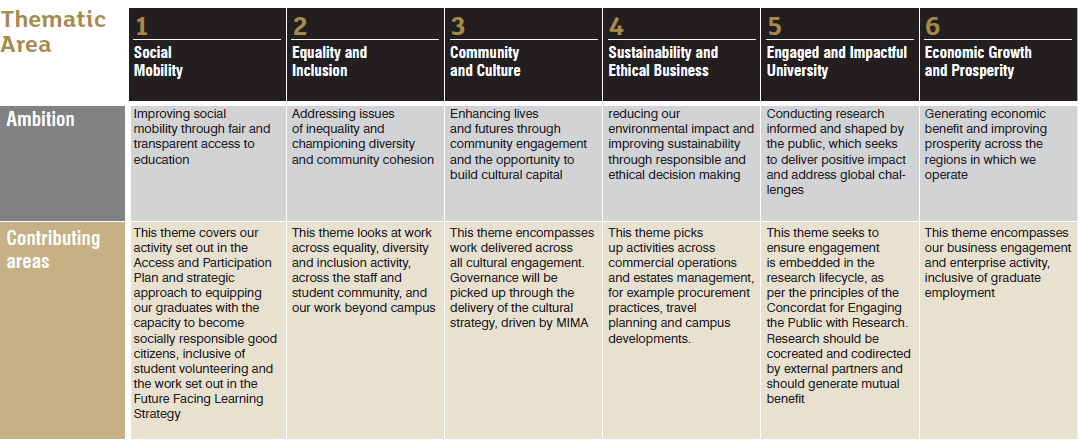 The Charter framework sets out an ambition for the University to be socially responsible and act as a good citizen; to lead by example, as an ethical business; to ensure activities are relevant, informed, accessible and inclusive; and to take action where the University’s expertise, facilities, people and position can deliver positive social and/or economic impact. PE activity is broadly concentrated in Charter Theme 5: Engaged and Impactful University, and progress driven through the thematic action plan.