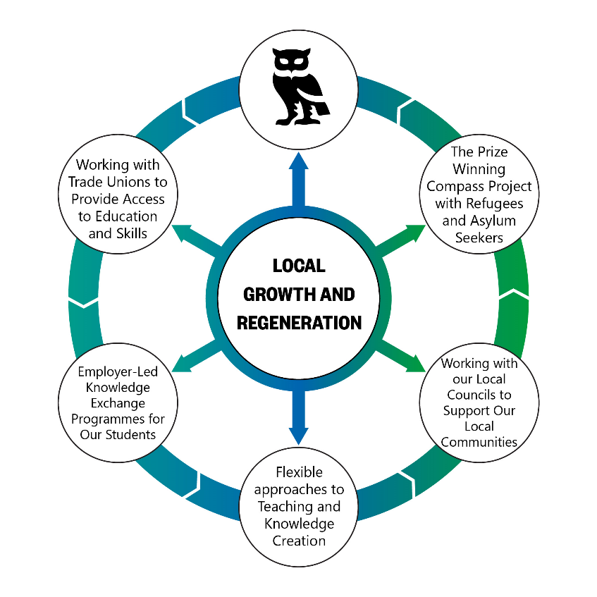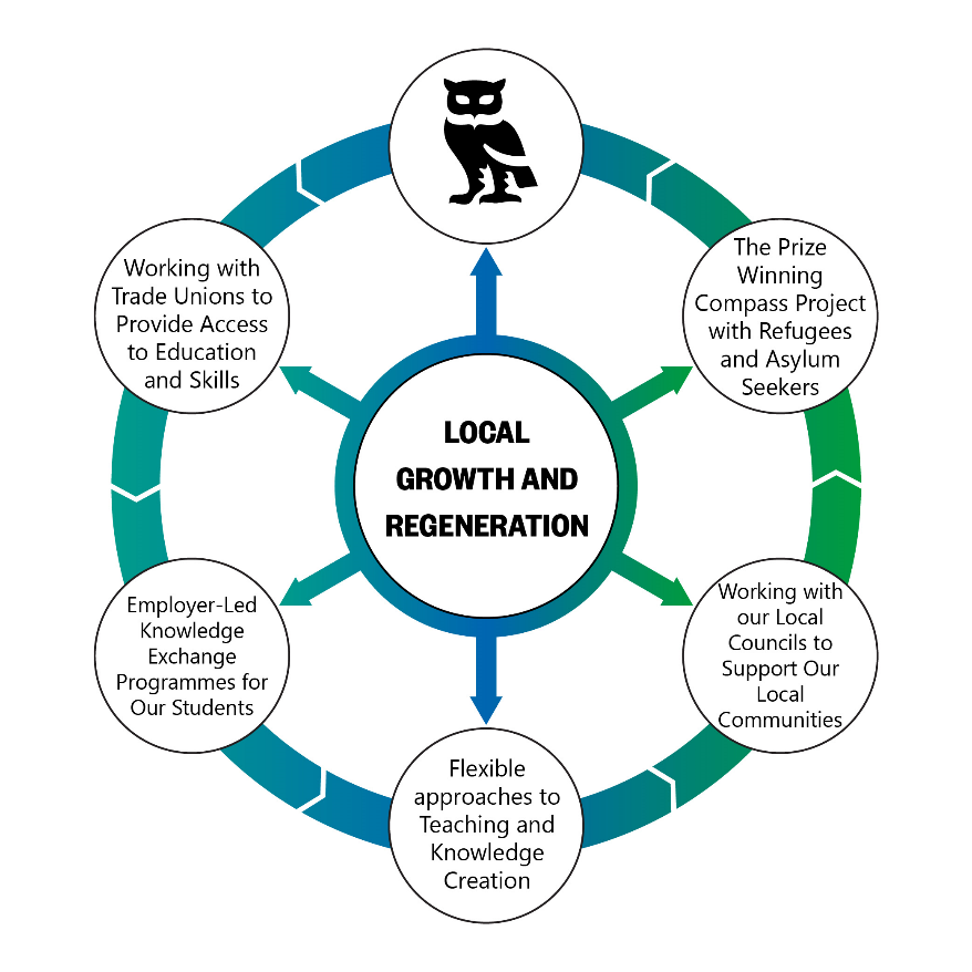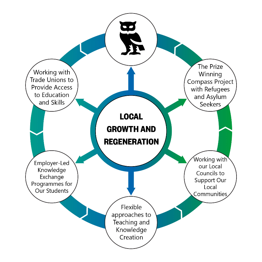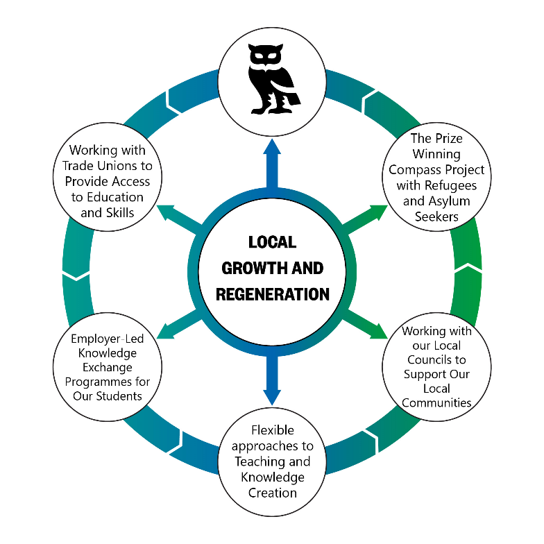 Our knowledge exchange strategy for research prioritises working with the most appropriate partners be they local, regional, national or international, or from the private, public or third sectors. This is described more fully in our Public and Community Engagement narrative. However, there are synergies between this global perspective and this local growth and regeneration strategy, for example, our researchers: