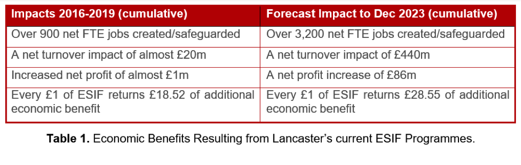 In 2019, Lancaster University commissioned an independent economic evaluation of our business innovation collaboration programmes funded through European Structural and Investment Funds (ESIF). Almost 200 SMEs were surveyed to assess the impact of the support they had received from the University. The evaluation provided us with an independent assessment of our work, whether our offer was fit for purpose and represented perceived and measurable value for both beneficiaries and funders. Table 1 shows the impacts achieved from 2016 to June 2019 and forecasted impacts to December 2023, across all programmes.