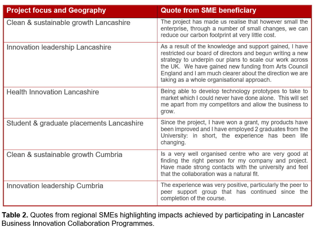 Mirroring our institutional Strategic Plan, our Knowledge Exchange Strategy outlines SMEs and regional sustainable growth as a priority objective. As a result, we continue to exert a disproportionately positive impact and influence on regional business innovation and economic growth, in collaboration with Lancashire, Cumbria and broader North West (NW) Local Enterprise Partnerships (LEPs).
