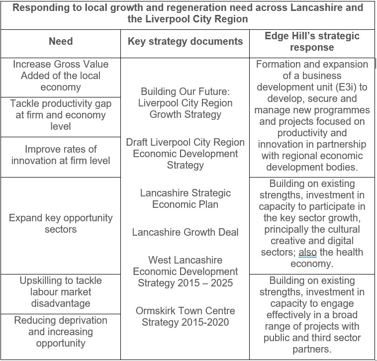 Edge Hill is an active partner in the development and delivery of local growth and regeneration strategy, and this has informed our needs assessment. This is demonstrated through our: